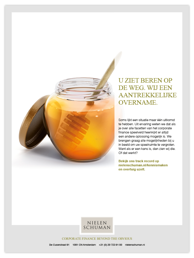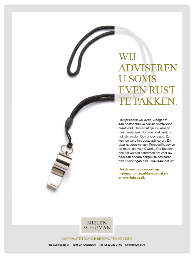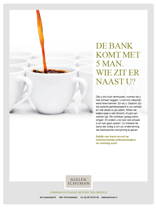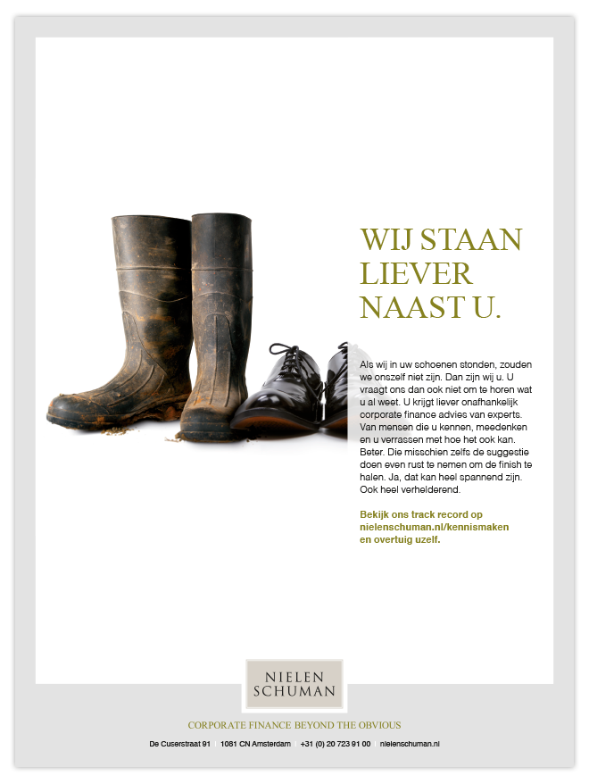Zo’n 15 jaar geleden vonden 4 bankiers het de hoogste tijd. Om gas terug te nemen in een financiële markt die op hol geslagen was. En te focussen op een gezonde, duurzame ontwikkeling. Met een strategisch advieskantoor dat het anders ging doen. Nielen Schuman, dé onafhankelijke corporate finance firma, richtte zich simpelweg op de relatie met de klant, en niet op een eventuele deal. En of dat werkte! Nielen Schuman groeide uit tot een meer dan serieuze speler in de Benelux. En dat mag iedereen weten.