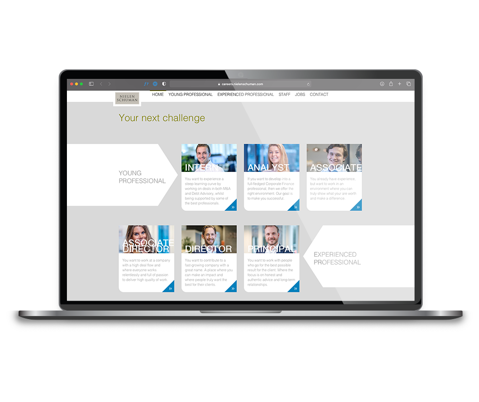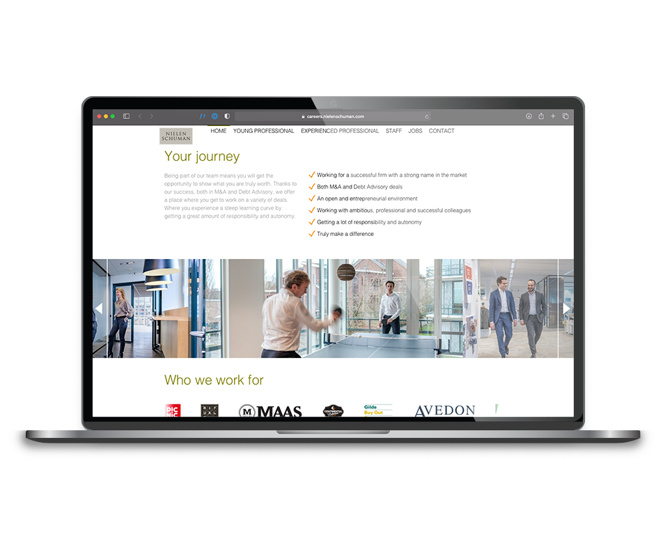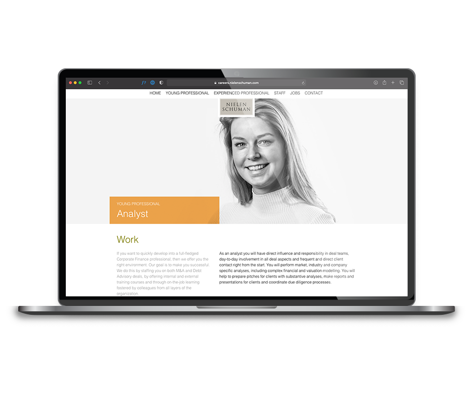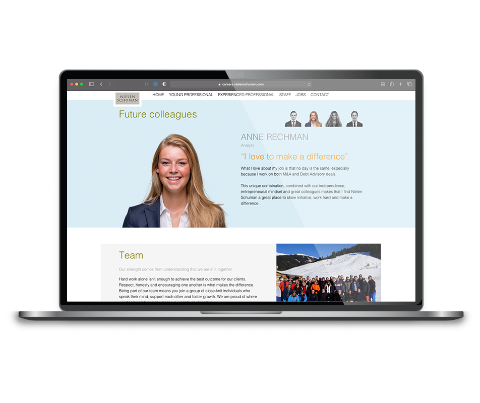 Beyond the obvious. Dat wil Nielen Schuman ook uitstralen als het over werken bij deze corporate finance adviseur gaat. Dus staken we de knappe koppen bij elkaar om te ontdekken hoe Nielen Schuman in de war for talent de juiste mensen met de juiste mentaliteit kan aantrekken. We ontwierpen er een soepel werkende career website voor die SuperBold bouwde en Nielen Schuman zelf makkelijk kan bijhouden. De schitterende fotografie van Rob ter Bekke maakt het plaatje met een kijkje in de keuken helemaal compleet. Hier wil je werken!