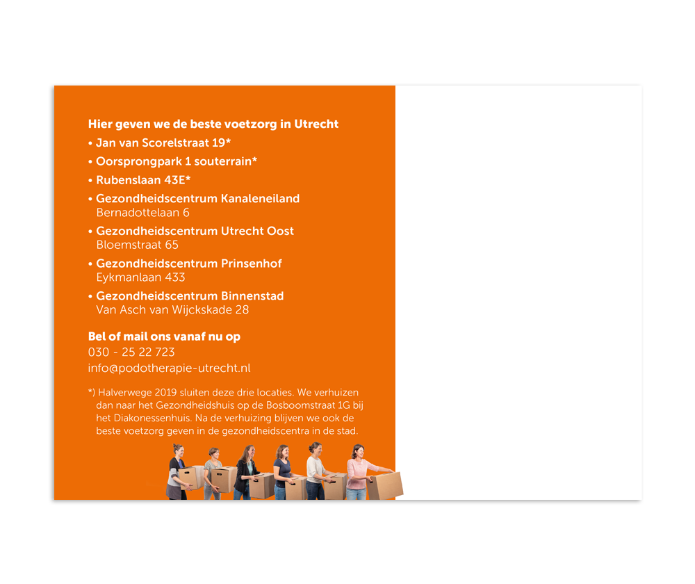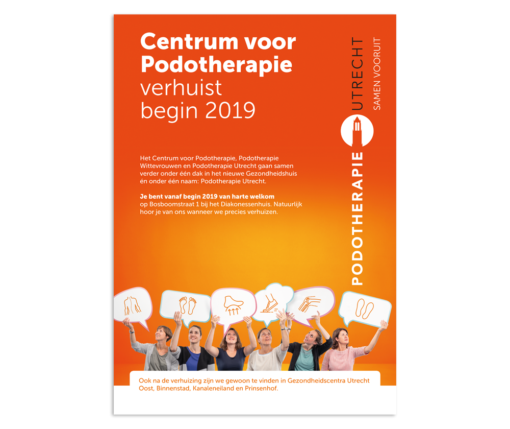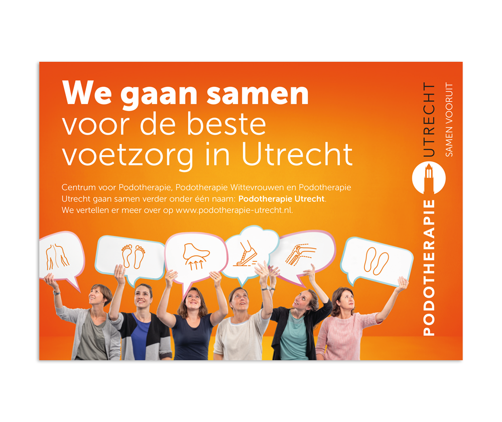 3 goedlopende praktijken willen samen verder. Onder 1 naam en met 1 herkenbare uitstraling. En o ja: “We gaan ook verhuizen naar het nieuwe Gezondheidshuis in Utrecht. We sluiten een paar vestigingen maar op andere locaties in de stad kun je nog steeds terecht voor de beste voetzorg.” Hoe pak je al die veranderingen met communicatie slim aan? Bij het begin vinden we. Dus keken we eerst waar de praktijken samen steengoed in zijn. Om daarna te laten zien welke uitstraling daarbij past en hoe dat eruitziet in middelen waarmee het nieuwe Podotherapie Utrecht naar buiten kan stappen.