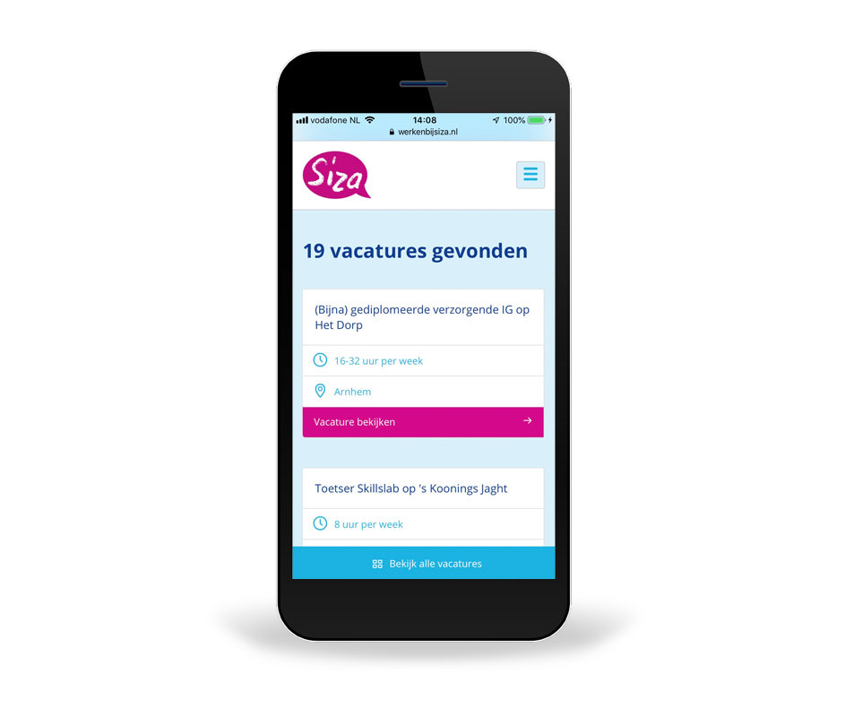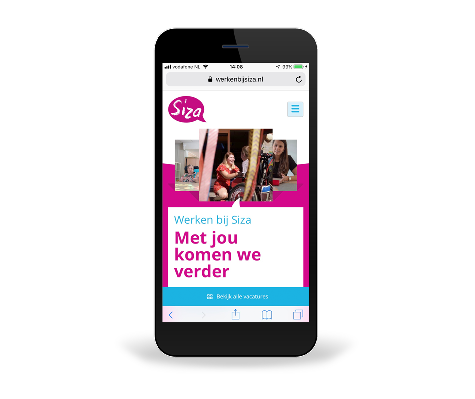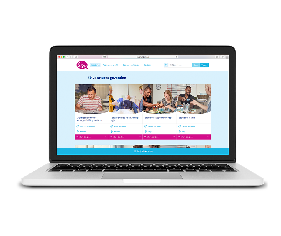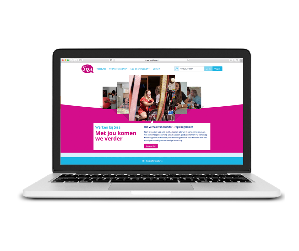 Jezelf neerzetten als een werkgever die actief naar mogelijkheden zoekt. Die je helpt om te blijven verbeteren, in een sector waar met steeds minder mensen en middelen steeds meer gedaan moet worden. Op een plek waar je enorm veel voor anderen betekent, maar ook veel van jou gevraagd wordt. Niet makkelijk. Uitdagend dus. Vonden wij en zorgorganisatie Siza ook. Dus zochten we samen naar de beste manier om dat te doen. In de ambitie en kernwaarden van Siza vonden we dé propositie: Met jou komen we verder. En precies dat verhaal vertaalden we naar een werkenbij-website waar alles draait om het vinden van de perfecte match. Daarom vertellen je aanstaande collega’s over hoe het is om bij Siza te werken, en maak je vanzelf de klik.