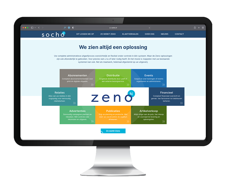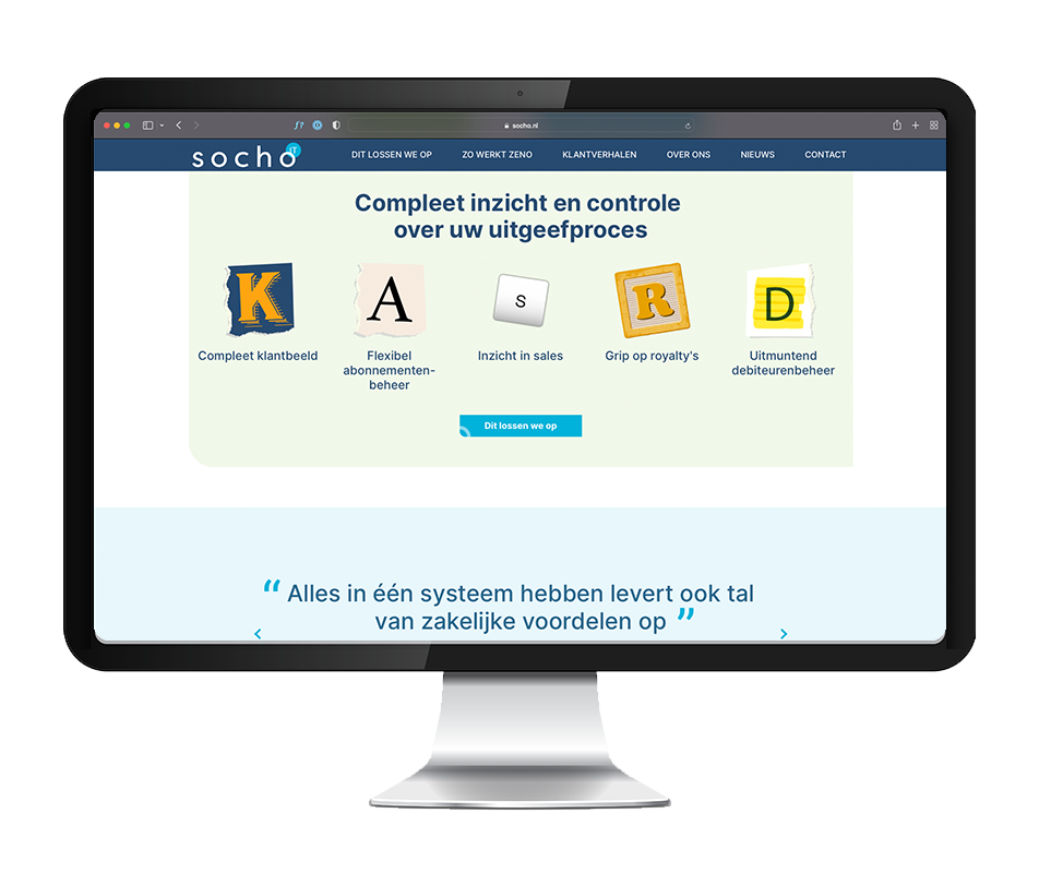 Socho IT wilde graag in contact komen met beslissers bij educatieve uitgeverijen. Omdat ze een prachtige en vooral praktische automatiseringsoplossing voor uitgeverijen in huis hebben. Dat stond allemaal op hun website die een opfrisser kon gebruiken. Dus pakten we de bouw van een nieuwe website samen met SuperBold meteen mee in de vraag. Kijk maar mee op socho.nl.