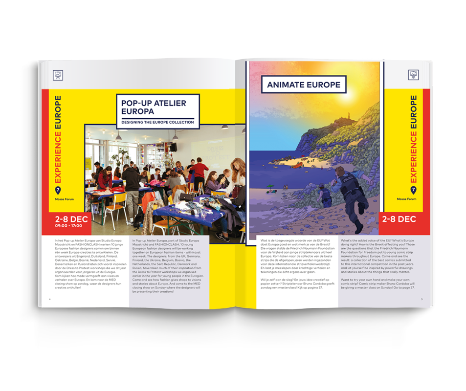 Het Verdrag van Maastricht maakt Maastricht beroemd. Maar het Europese karakter is zeker niet alleen symbolisch. Maastricht is dé plek waar iedere Europeaan is uitgenodigd om mee te denken, kritische vragen te stellen en te dromen. Daarom organiseert Studio Europa Maastricht ieder jaar de Maastricht Europe Days. En wij maakten de middelen voor dit weekend vol bijzondere ontmoetingen, kritische debatten, vindingrijke workshops en een breed cultureel programma. In Dutch en in ’t Engels.