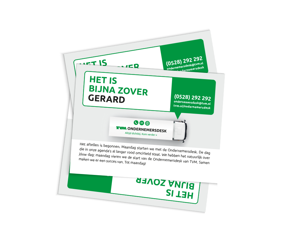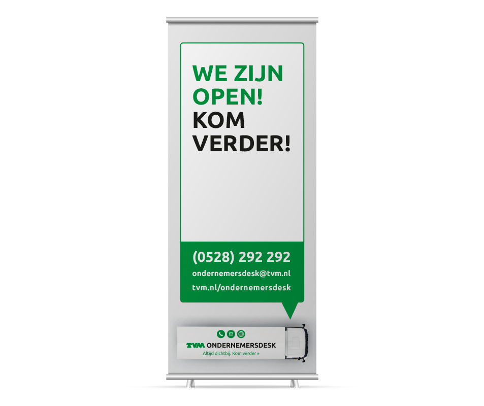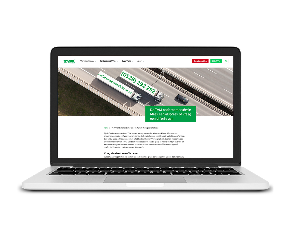 TVM neemt eigen rijders en kleine ondernemers in wegtransport graag alles uit handen. Behalve het stuur. Daarom introduceerde TVM de Ondernemersdesk. Dé plek waar ondernemers terechtkunnen voor snel antwoord op vragen en deskundig advies. Om iets wat dwars zit op te lossen, zodat ze weer verder kunnen. Wij bedachten voor de introductiecampagne een plakkende slogan en maakten middelen om de bereikbaarheid van de Ondernemersdesk onweerstaanbaar gemakkelijk te maken.