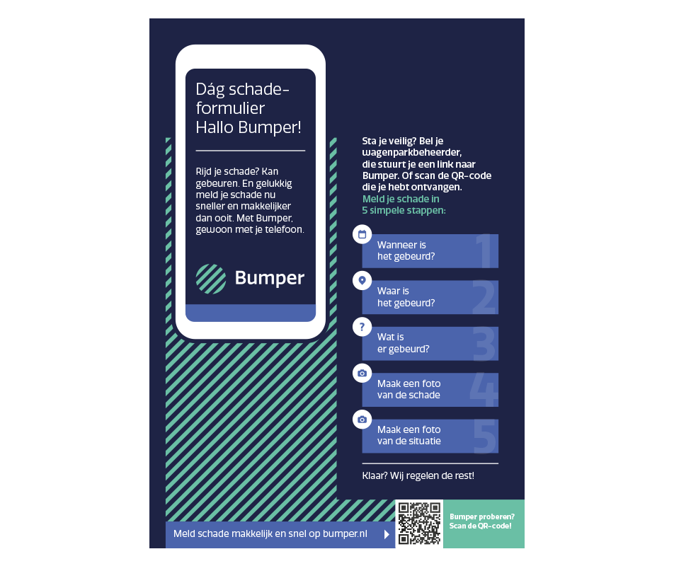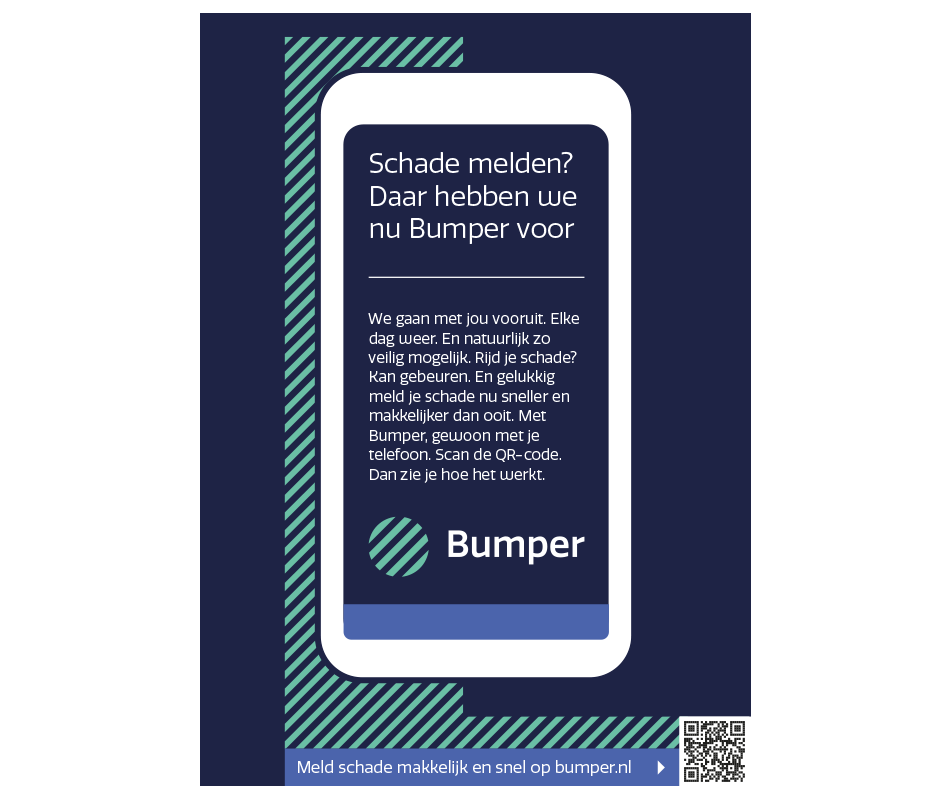 Bumper is een initiatief van TVM. Een digitale oplossing die helpt schade te melden en de administratie makkelijk maakt. Dat is niet alleen handig voor transportondernemers en chauffeurs. Ze hebben ook helder inzicht in waar onderweg de risico’s liggen. Dan weet je ook hoe je schade vóór kan zijn. Met verschillende middelen geven we TVM een zetje om Bumper in de markt te zetten. Van advertenties tot welkomstpakketten met wegwijzers in 5 talen en beursmateriaal.