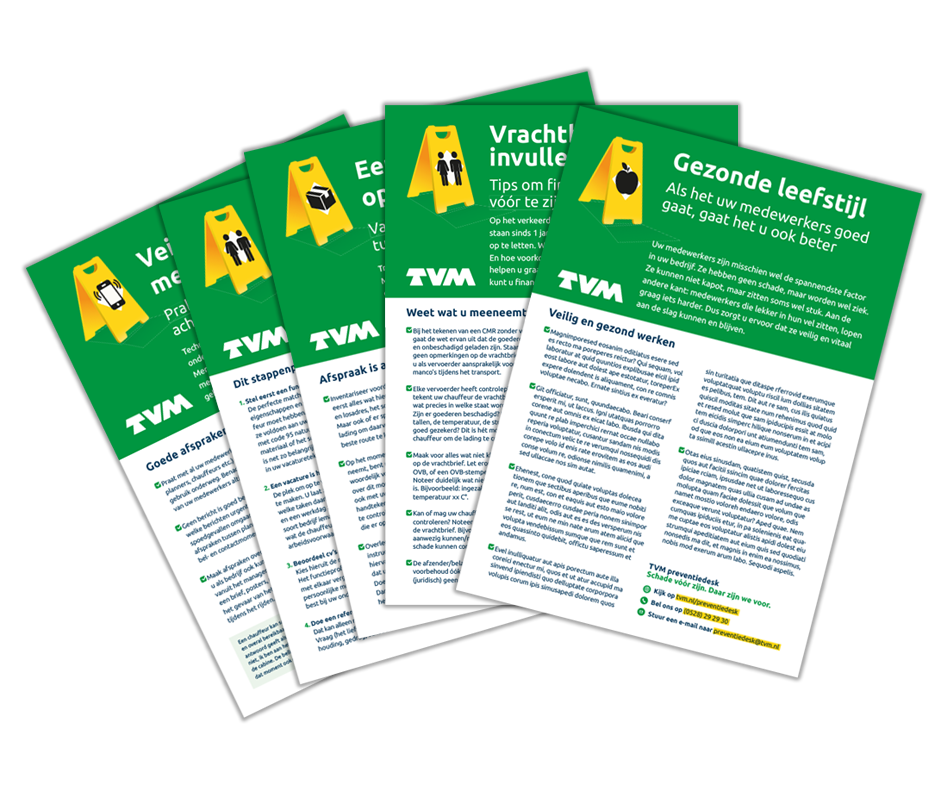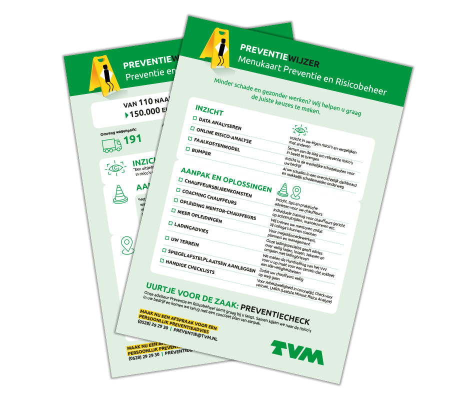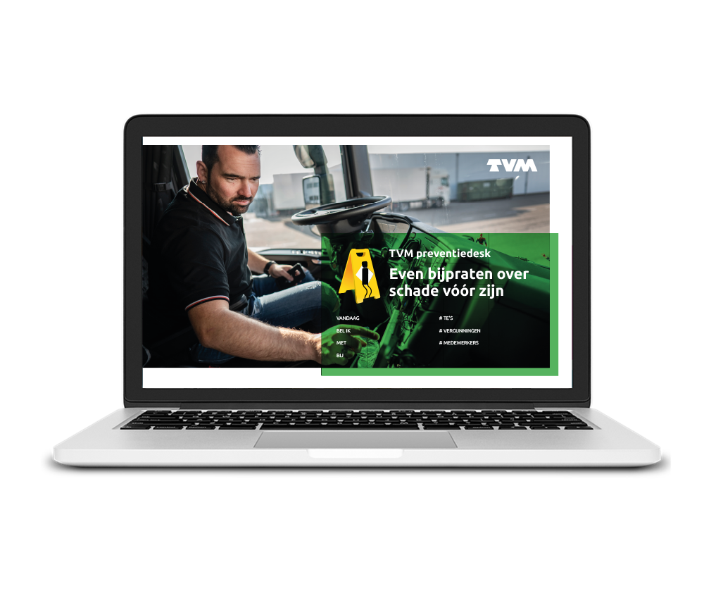 Met slimme oplossingen en praktische tips helpt de Preventiedesk van TVM schade voorkomen. Zo is een deskundig adviseur altijd dichtbij voor persoonlijk advies over veiligheid onderweg en in het bedrijf. Hoe laten we transportondernemers kennismaken met de Preventiedesk? En welke middelen geven de preventie- en risicoadviseurs houvast om te praten over risico's en die in kaart te brengen? Daar hadden we wel een paar ideeën voor.