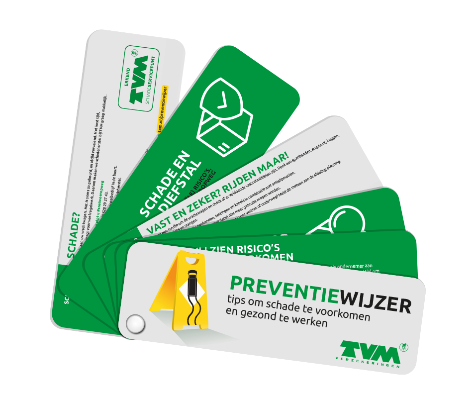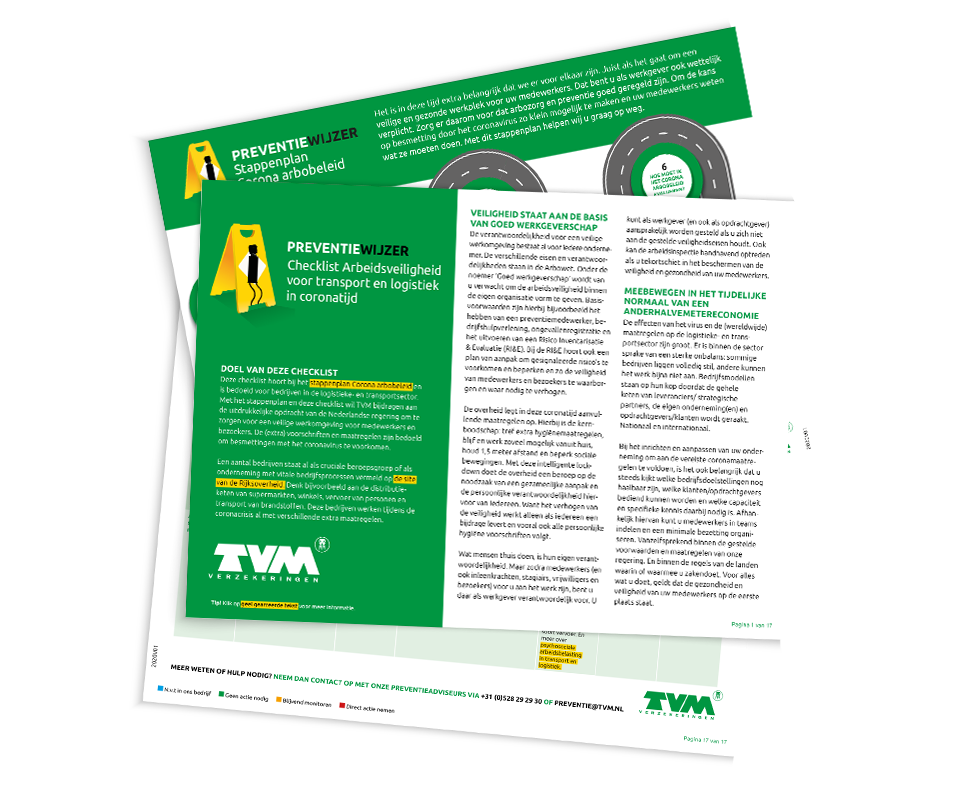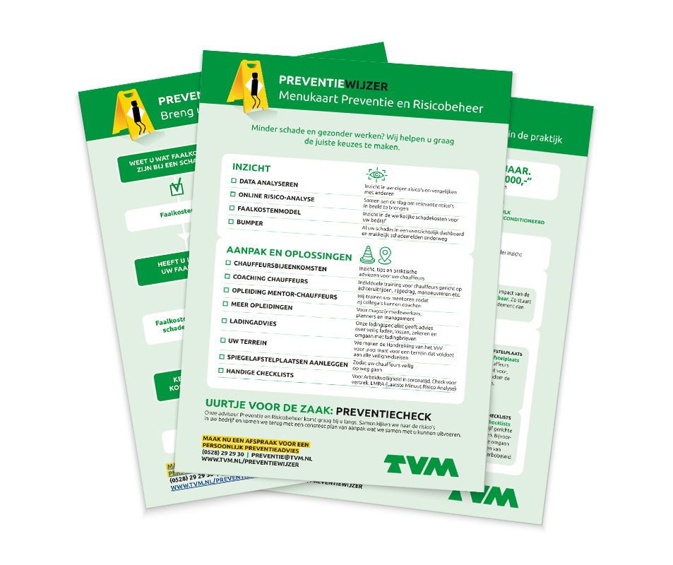 Veel schade is te voorkomen. TVM weet er alles van en deelt die kennis graag met transportondernemers en chauffeurs. Samen bedachten we Preventiewijzer: allemaal handige tips, online risicoscans en preventiechecks om risicovolle plekken en situaties te ontdekken en er wat aan te doen. Ook als het gaat om maatregelen die je nu in coronatijd moet nemen in je arbobeleid om te zorgen voor een veilige en gezonde werkplek.